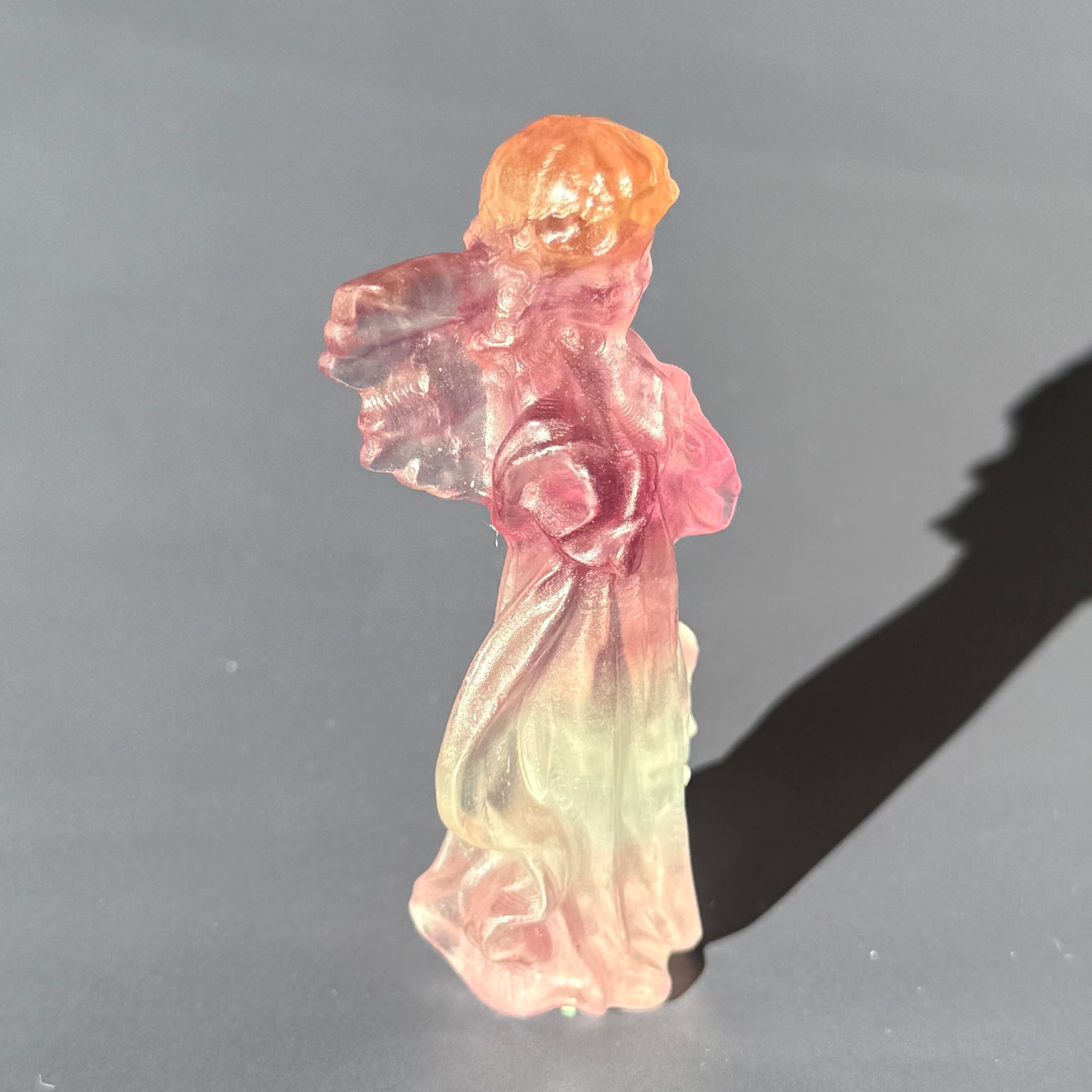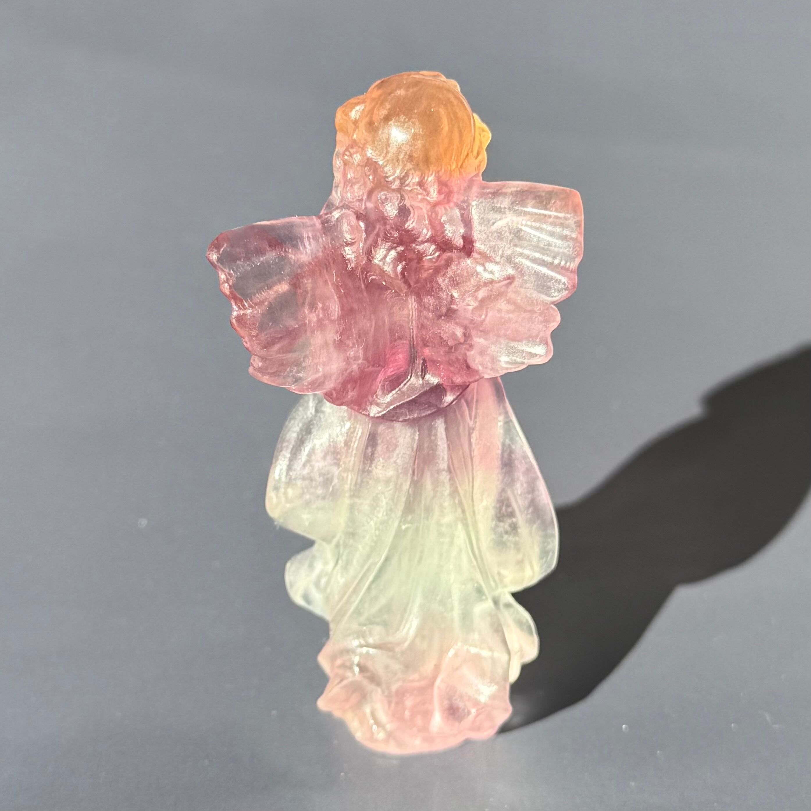 キャンディフローライトで作られた天使のオブジェは、優しい色合いと美しい透明感が魅力的な一品です。